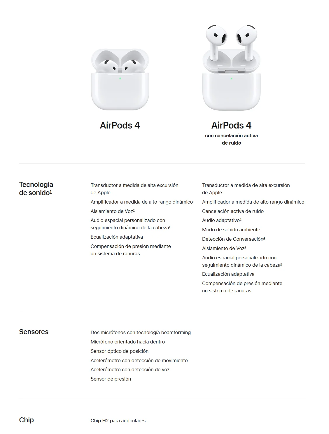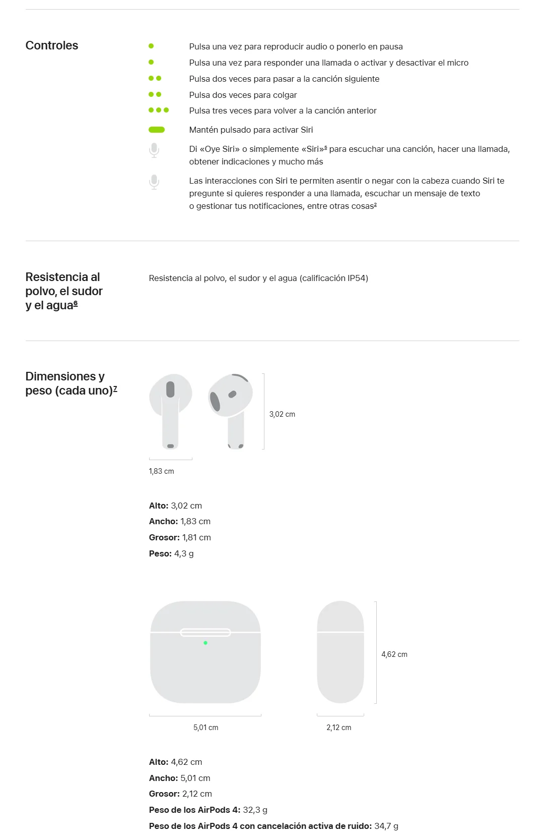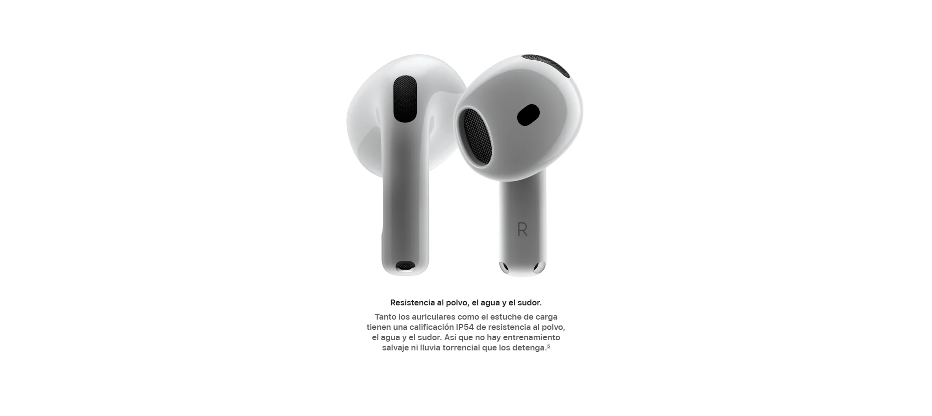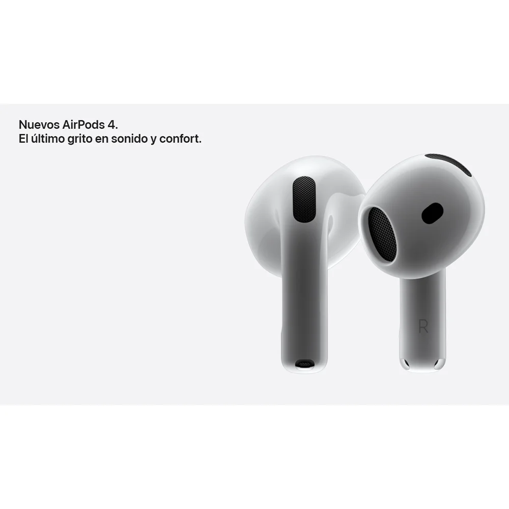 • Nuevos AirPods 4. Dos modelos rediseñados de arriba abajo para ofrecerte un ajuste y un sonido increíbles. Por primera vez, disponibles con cancelación activa de ruido. El potente chip H2 está detrás de una mayor claridad en las llamadas con Aislamiento de Voz y una nueva forma de interactuar con Siri en manos libres. Nota a pie de página El audio espacial personalizado con seguimiento dinámico de la cabeza te sumerge por completo en el sonido. Nota a pie de página Tienen una calificación IP54 de resistencia al polvo, el sudor y el agua. Nota a pie de página Y la carga por USB‑C te da hasta 30 horas de reproducción de audio con el estuche. Nota a pie de página.
