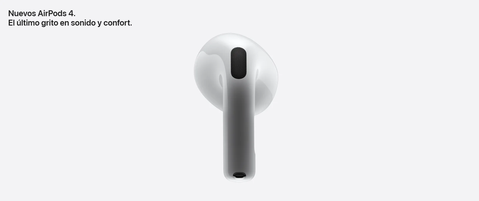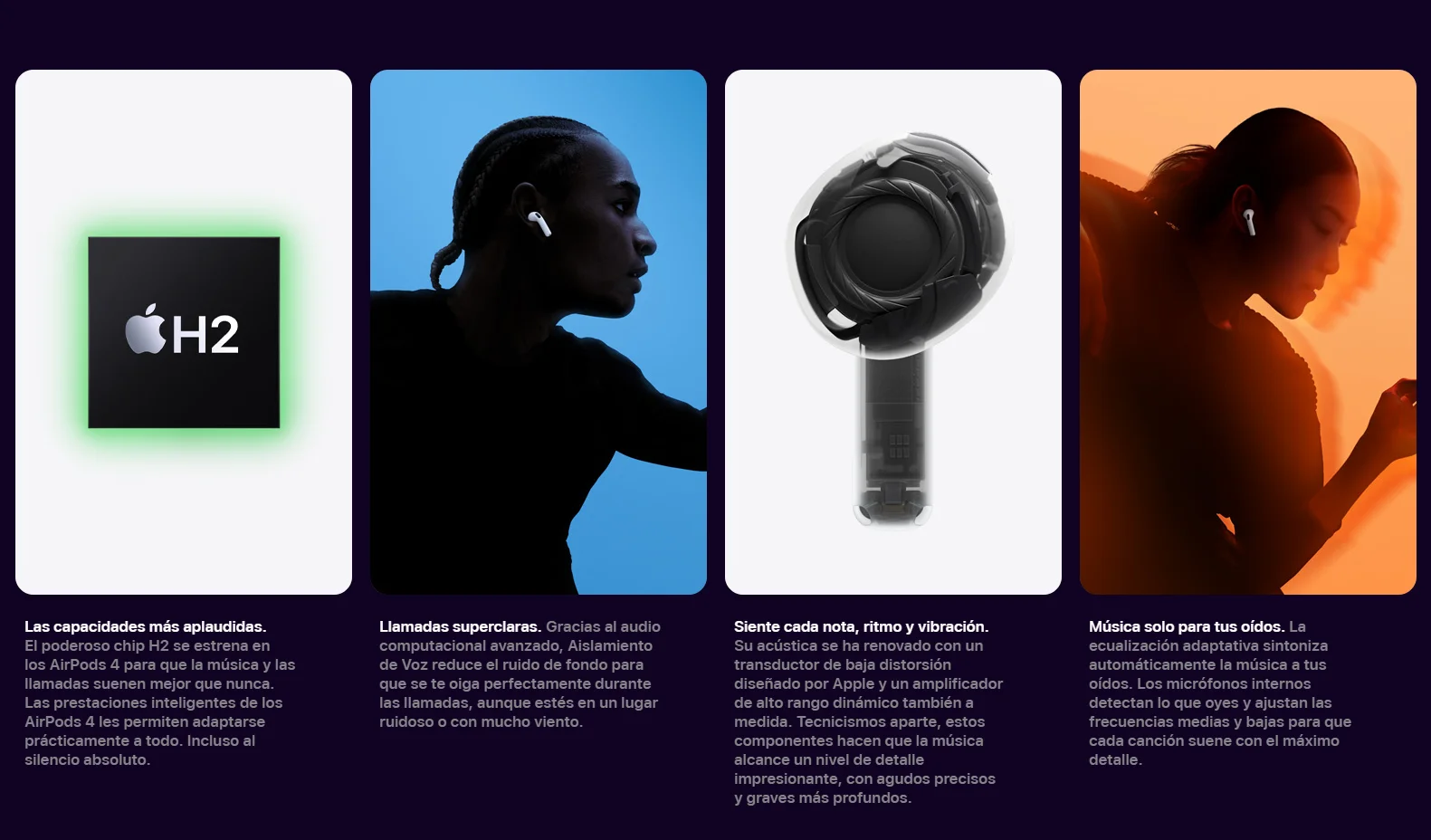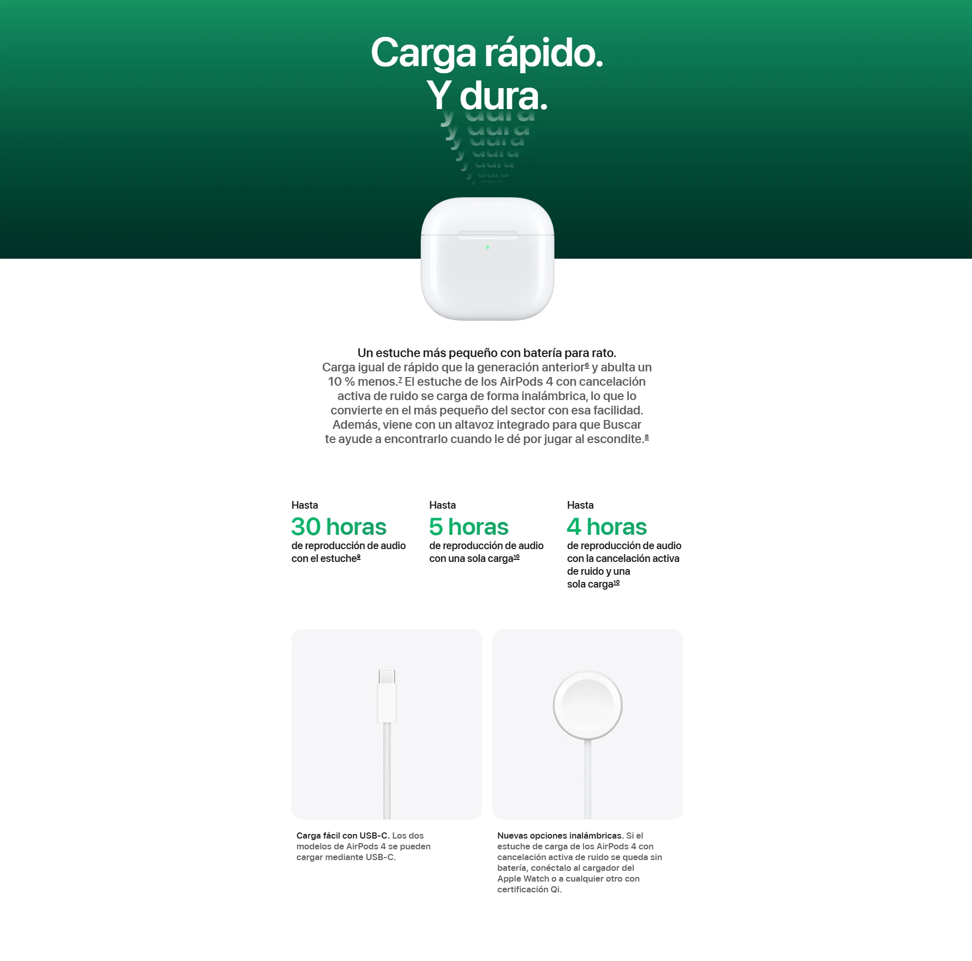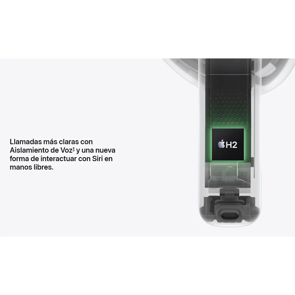 • Nuevos AirPods 4. Dos modelos rediseñados de arriba abajo para ofrecerte un ajuste y un sonido increíbles. Por primera vez, disponibles con cancelación activa de ruido. El potente chip H2 está detrás de una mayor claridad en las llamadas con Aislamiento de Voz y una nueva forma de interactuar con Siri en manos libres. Nota a pie de página El audio espacial personalizado con seguimiento dinámico de la cabeza te sumerge por completo en el sonido. Nota a pie de página Tienen una calificación IP54 de resistencia al polvo, el sudor y el agua. Nota a pie de página Y la carga por USB‑C te da hasta 30 horas de reproducción de audio con el estuche. Nota a pie de página.