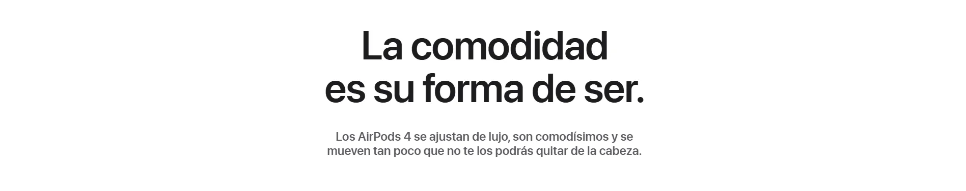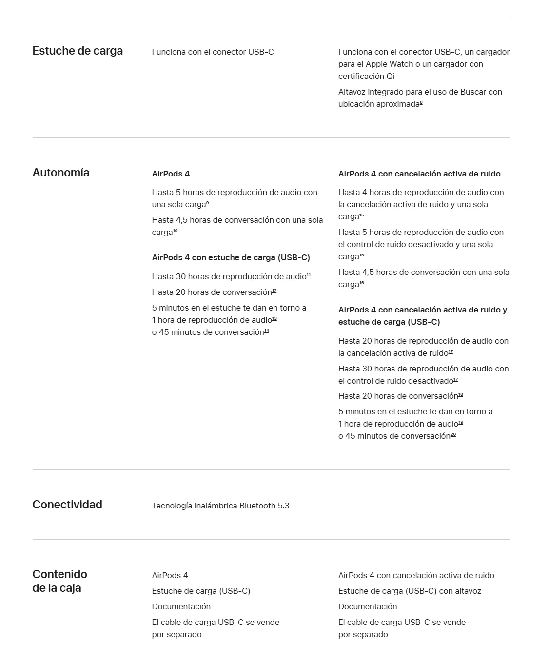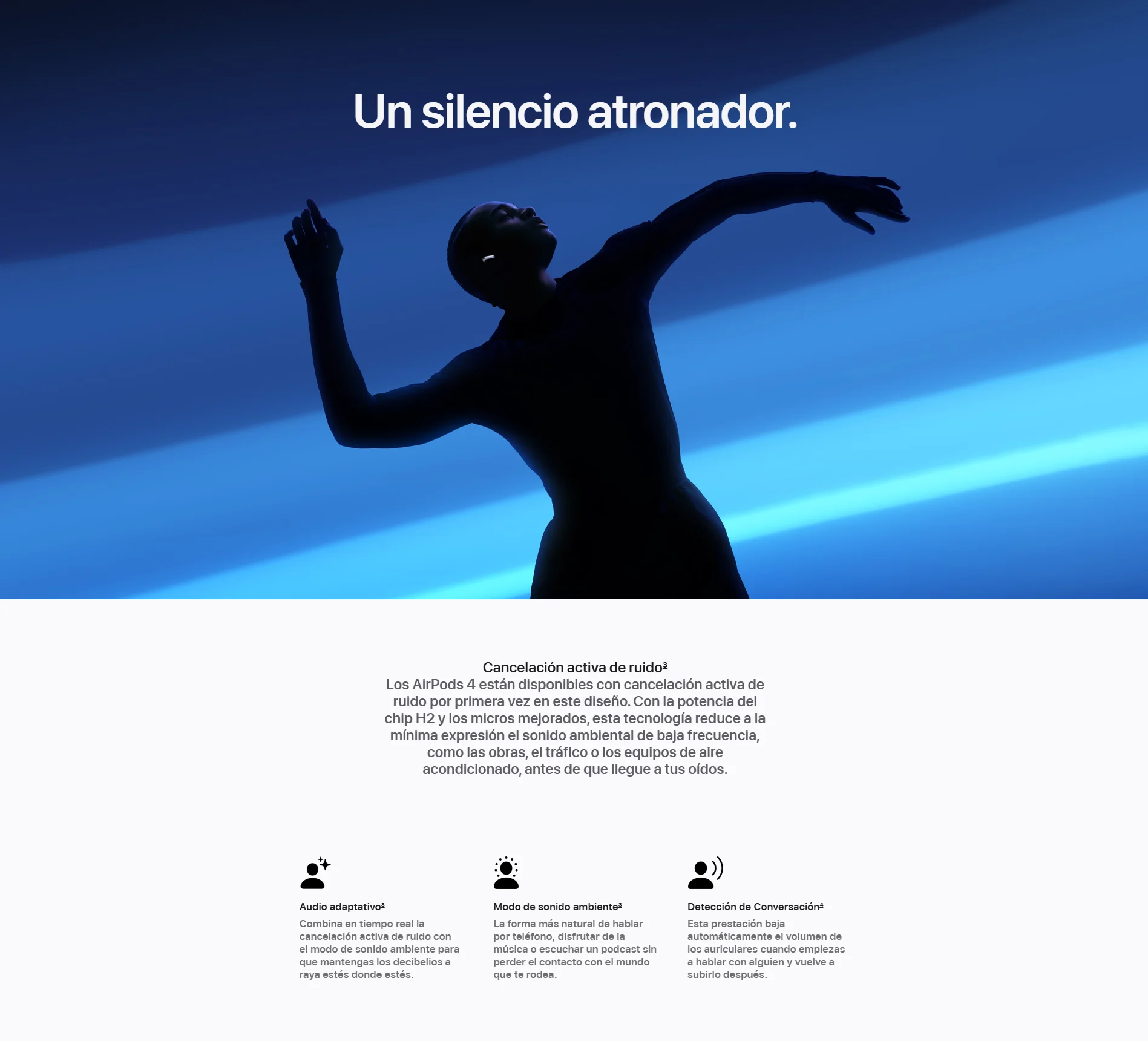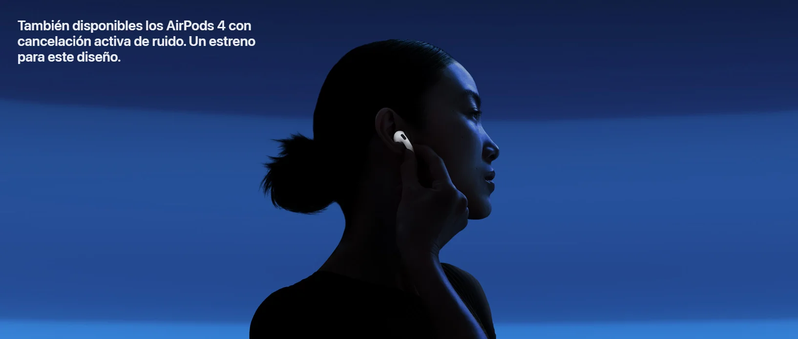• Nuevos AirPods 4. Dos modelos rediseñados de arriba abajo para ofrecerte un ajuste y un sonido increíbles. Por primera vez, disponibles con cancelación activa de ruido. El potente chip H2 está detrás de una mayor claridad en las llamadas con Aislamiento de Voz y una nueva forma de interactuar con Siri en manos libres. Nota a pie de página El audio espacial personalizado con seguimiento dinámico de la cabeza te sumerge por completo en el sonido. Nota a pie de página Tienen una calificación IP54 de resistencia al polvo, el sudor y el agua. Nota a pie de página Y la carga por USB‑C te da hasta 30 horas de reproducción de audio con el estuche. Nota a pie de página.
